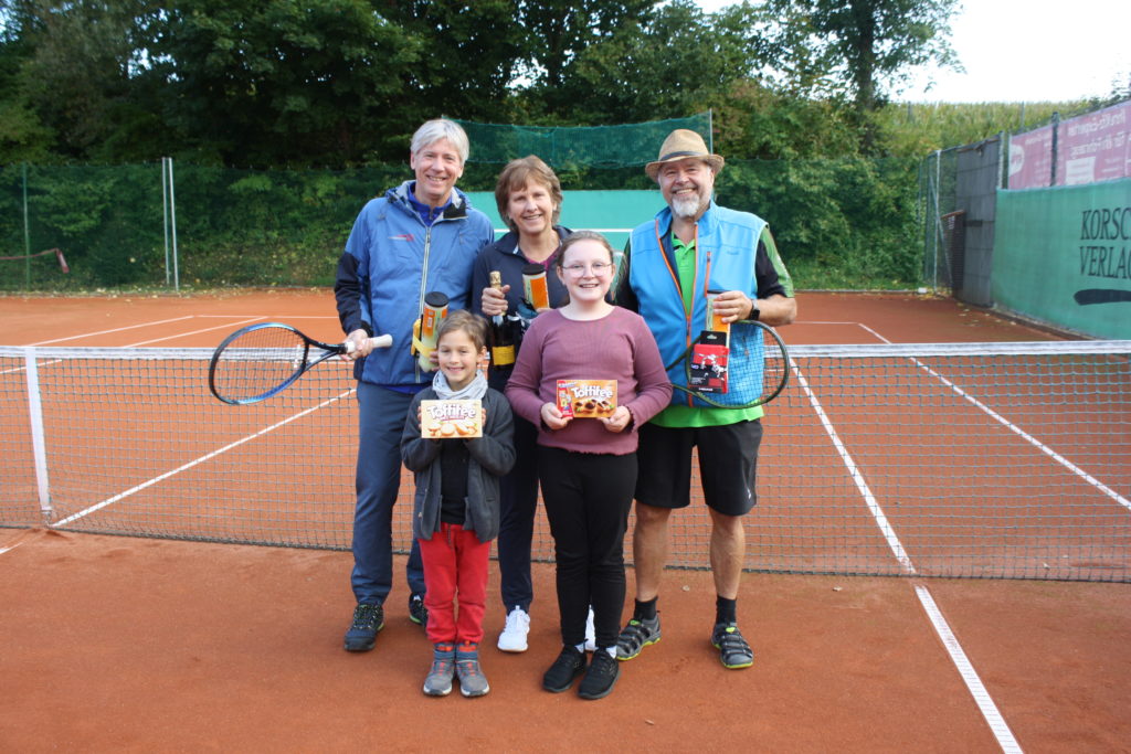 Die Freiluftsaison in der Tennisabteilung wurde traditionell mit dem Schleiferlturnier am 03. Oktober beendet. Gespielt wurden mehrere Runden Doppel in gelosten Paarungen. Genau 16 aktive Turnierteilnehmer verteilten sich dabei perfekt auf unsere 4 Plätze. Die Damen, welche diesmal das Turnier leiteten, hatten dabei nicht viel zu tun – übernahmen doch Losfee Leonie und ihr Assistent Daniel die Schriftführung. So verkündeten die beiden am Ende auch die drei glücklichen Sieger. Im Anschluss wurde noch gemeinsam gegrillt.